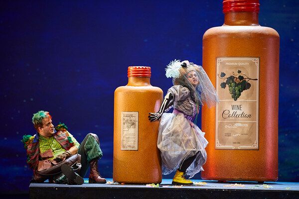Tamino and Papageno are challenged to undergo various trials to prove that they are fit to be accepted into the circle of insiders. Firstly, they have to learn to remain silent which is difficult, particularly for Papageno. When an elderly woman appears, he is unable to keep this up and asks her what her name is. She then disappears with a clap of thunder. Papageno comforts himself with food and drink which is miraculously served to them both. Only Tamino remains silent and plays his flute for solace. Pamina appears but cannot understand why Tamino is no longer speaking to her. Her mother – the queen of the night – had previously tried in vain to persuade her to murder Sarastro. When, in her despair, she tries to take her life, the three young boys snatch the dagger away from her and lead her back to Tamino. Together they face the final test, the fire and water challenge. Protected by the magic sounds of the flute, they pass the test. Meanwhile, Papageno, in his loneliness, wishes that the elderly lady reappears and promises her that he will take her as his wife “as long as he doesn’t find anyone better”. She then transforms into a beautiful young girl but is taken away from him as the time has not yet come. Out of despair, Papageno wants to take his life but the three young boys remind him of the bells. The sound makes Papagena appear and both dream of a future with many children. The other couple is also happy: Tamino and Pamina, as future rulers, are accepted into the group of insiders and glorify the ideals of nature, wisdom and reason. Only the queen of the night comes to a bad ending: when she tries to enter the temple with her entourage, she is engulfed by the powers of darkness.