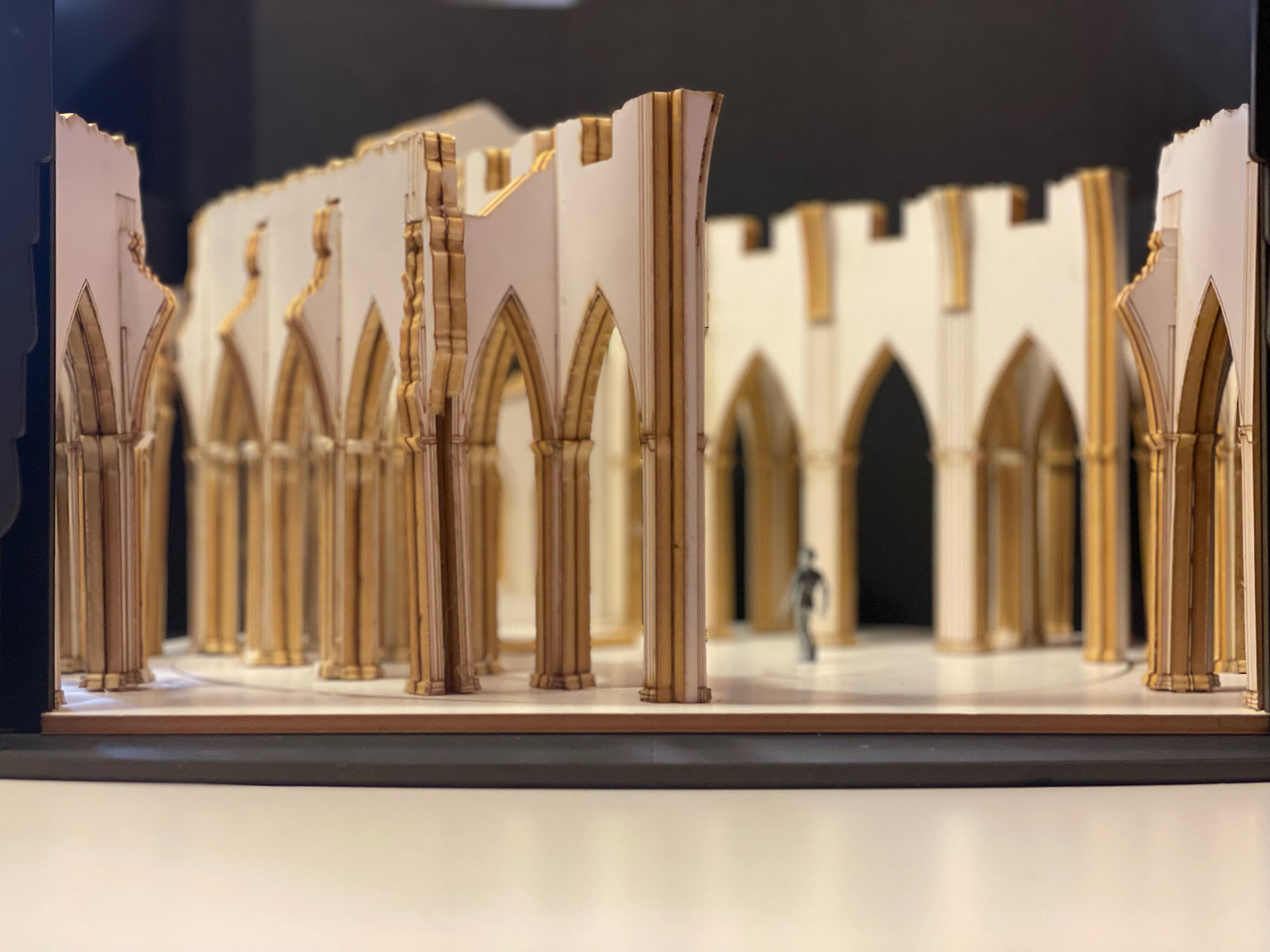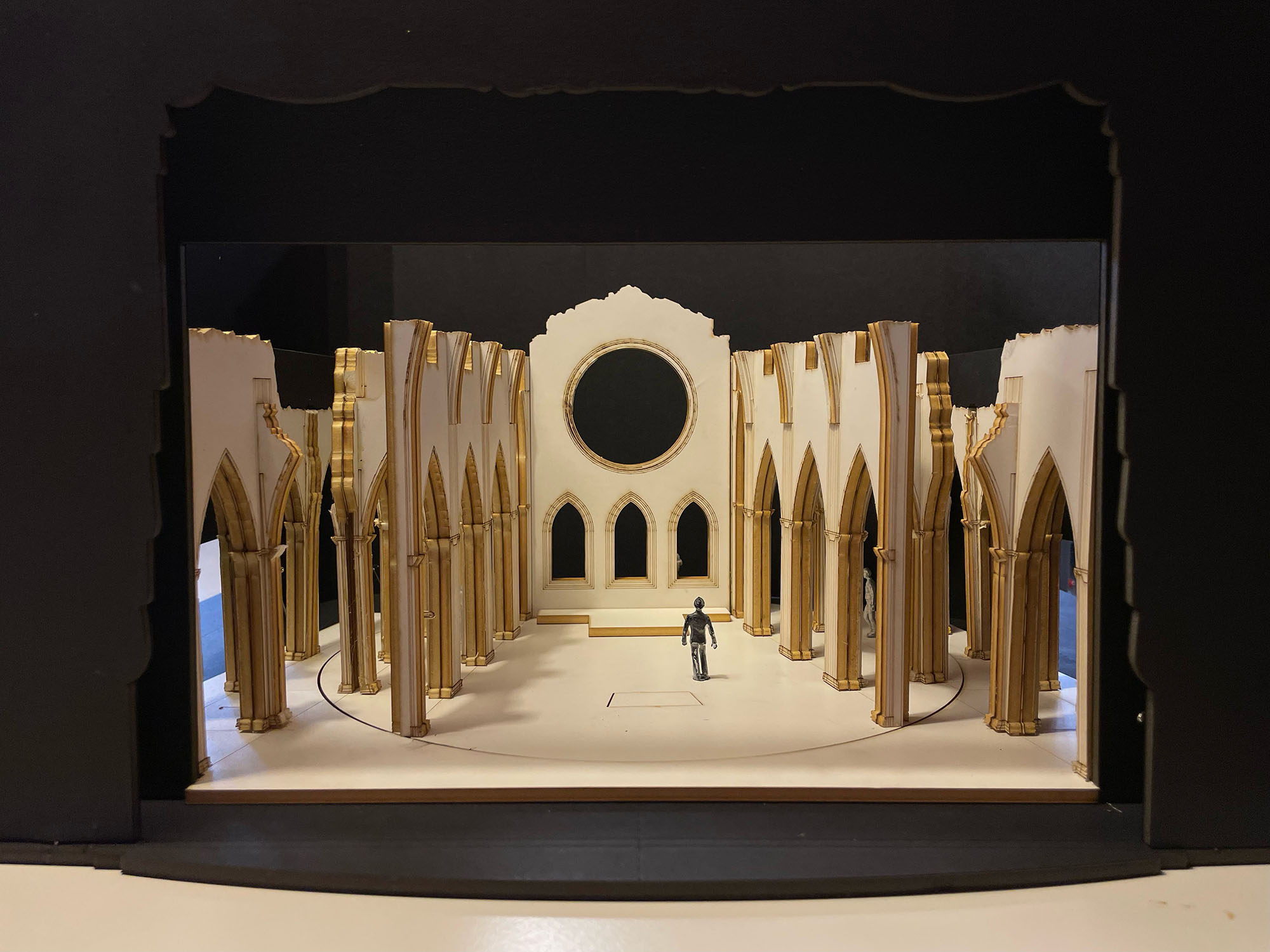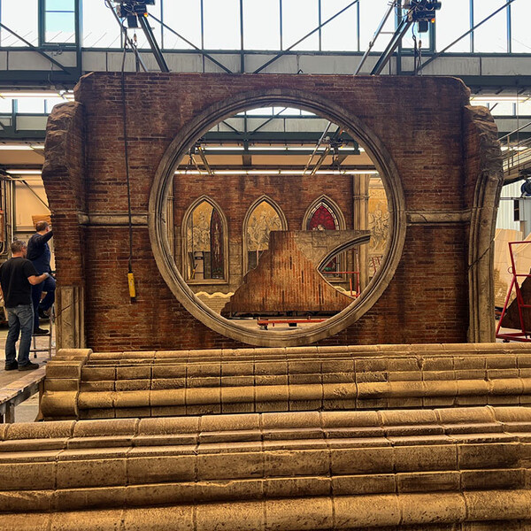 FPS — Natürlich gibt es im digitalen Zeitalter andere technische Möglichkeiten, eine künstlerische Idee zu verwirklichen. Die theoretische Vorarbeit ist da deutlich einfacher. Aber die künstlerische Umsetzung der Idee bedeutet heutzutage nach wie vor Handarbeit. Toll, was Dekorationswerkstätten und Technik bei unserer aktuellen Inszenierung geleistet haben. Aber einen großen Unterschied zu den früheren Arbeiten gibt es natürlich: Altenkirch entwarf eher zweidimensionale Kulissen, in denen er durch geschickte Licht- und Farbspiele versuchte, eine Raumtiefe zu erzeugen. Unsere Bühnenraumidee 2026 ist dreidimensional – eine Kirchenruine. Sie wird im Laufe der Handlung gedreht, ist wandelbar, von überall einsehbar und birgt viele Spielmöglichkeiten in sich.